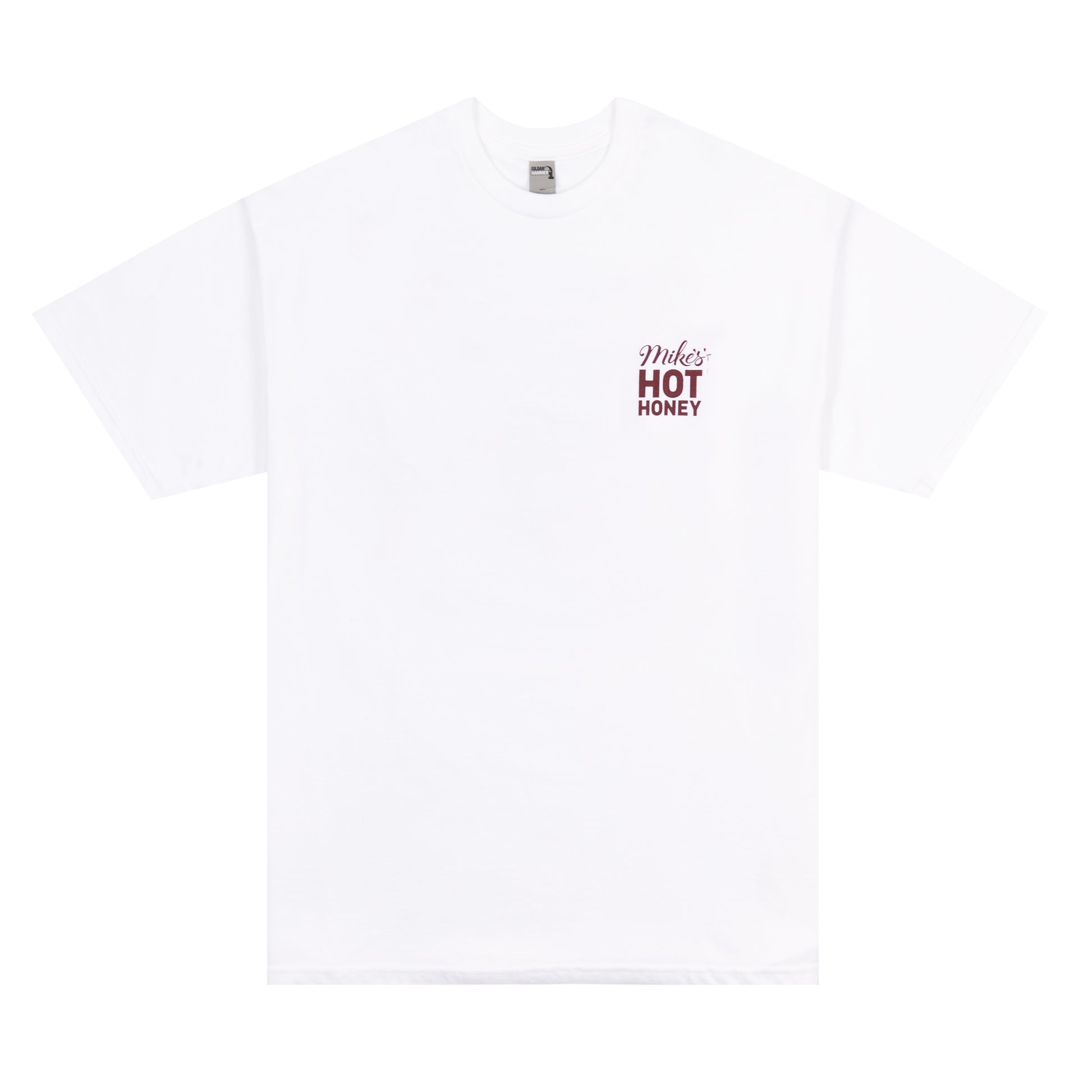 Front of the t-shirt features the Mike’s Hot Honey master logo on the left chest.  Back of the t-shirt features the MHH Heritage logo.
