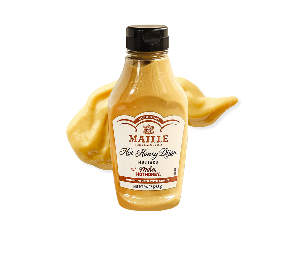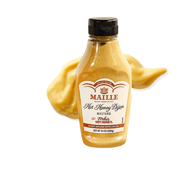 Maille x Mike's Hot Honey launch brand's first ever co-branded retail product: Maille Hot Honey Dijon mustard made with Mike's Hot Honey.
